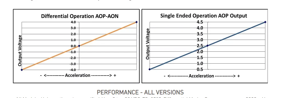 These Accelerometers produce differential analog output voltage pairs (AON & AOP) which vary with acceleration. The signal outputs are fully differential about a common mode voltage of approximately 2.5 volts. At zero acceleration, the output differential voltage is nominally 0 volts DC; at ±full scale acceleration, the output is ±4 volts DC, respectively, as shown in the figure (below). The output scale factor is independent from the supply voltage of +8 to +32 volts.