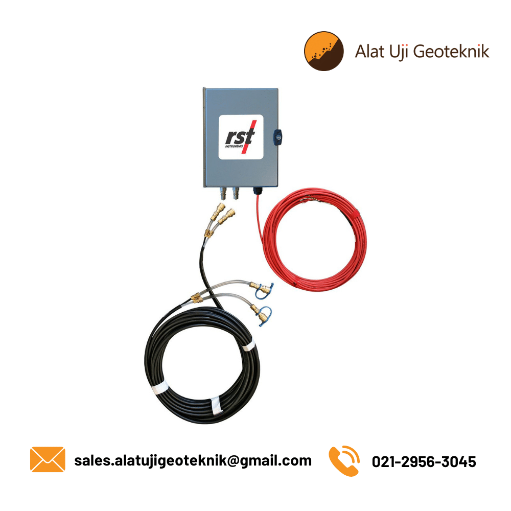 RST Vibrating Wire Liquid Settlement System SSVW105 berfungsi untuk memantau penurunan atau kenaikan tanah pada berbagai struktur buatan manusia, seperti timbunan jalan serta bendungan tanah dan batu. Sistem ini terdiri dari tabung berisi cairan, reservoir (wadah penampung), selang fleksibel, serta sensor dan alat baca (readout).Cara kerjanya adalah dengan memasang sensor tekanan (vibrating wire) pada pelat khusus di titik yang ingin dipantau. Sensor ini dihubungkan melalui dua selang berisi cairan ke reservoir yang ditempatkan di tanah yang stabil (tidak bergerak). Sensor tersebut kemudian mengukur tekanan cairan di antara posisi sensor dan reservoir untuk mengetahui perubahan ketinggiannya. Selain itu, selang berisi cairan ini juga bisa dikuras atau dibersihkan (flushed).